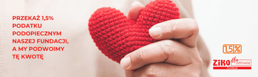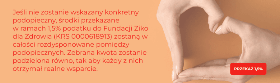 W tym roku przekazując 1,5% podatku na rzecz naszych podopiecznych, pomagacie Państwo podwójnie. Fundacja Ziko dla Zdrowia podwoi łączną kwotę zebraną w ramach 1,5%, co oznacza, że każda przekazana złotówka przełoży się na dwa razy większe wsparcie dla naszych podopiecznych wymagających leczenia i rehabilitacji.